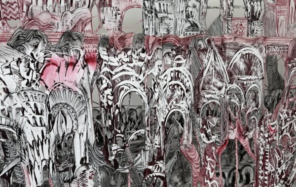 Philosophical zombies collide with mystical anarchy to converge in a playful darkness in the gallery. This is the case in Kata Unger’s tapestries, where codes and chaos blend. The exhibition creates a space where systems collapse and new meanings emerge. The voices of the six artists transcend certainties, allowing the strange to speak for itself.
